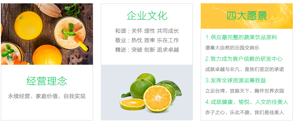 在公司發(fā)展壯大的13年里,我們始終為客戶提供好的產(chǎn)品和技術支持、健全的售后服務,不斷引進國外的先進技術和科學管理模式,逐步健全了與產(chǎn)品發(fā)展相適應的具有農(nóng)產(chǎn)品加工特點的質(zhì)量管理體系,全體職員本著“和諧、敬業(yè)、精進”的理念,竭誠為國內(nèi)外的顧客提供最優(yōu)質(zhì)的服務。我公司采用國內(nèi)、外先進生產(chǎn)設備,年生產(chǎn)能力20000噸以上,主要產(chǎn)品包括:橙濃縮汁、蜜橘濃縮汁、柑橘原汁、檸檬原汁、血橙濃縮汁、芒果漿、橙果粒罐頭、橙瓣罐頭、白柚果粒罐頭、仙草凍罐頭、檸檬切片罐頭、速凍橙蓉、速凍檸檬蓉、速凍橙皮(丁、絲)、速凍檸檬皮(丁、絲)、蜜漬橙皮檸檬片、柚子等。南充佳美產(chǎn)品行銷覆蓋全國及遠銷海內(nèi)外,是國內(nèi)濃縮汁、原汁、及速凍產(chǎn)品行業(yè)規(guī)格最大、最具競爭力的企業(yè)之一,期待與您的合作。